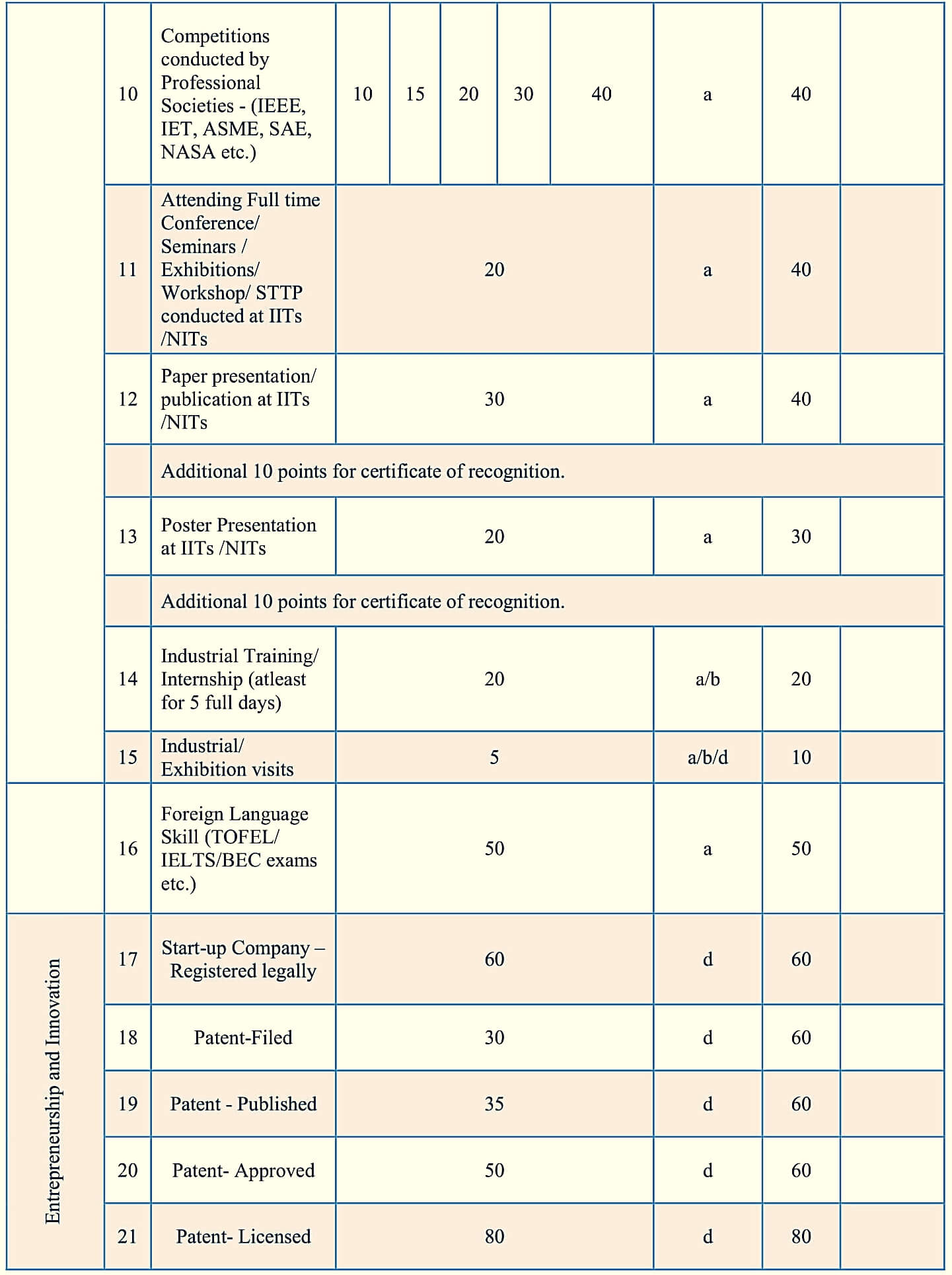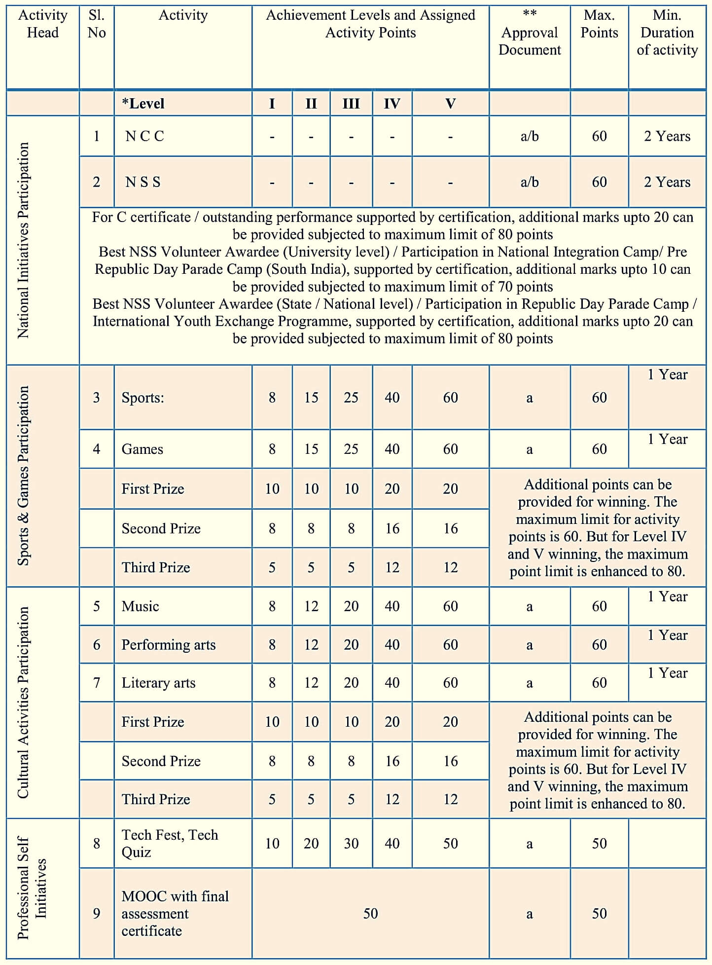 The following table gives the list of activities under each of these segments, the level of achievement expected, activity points, evidence needed to assign the points and the minimum duration needed for certain activities.