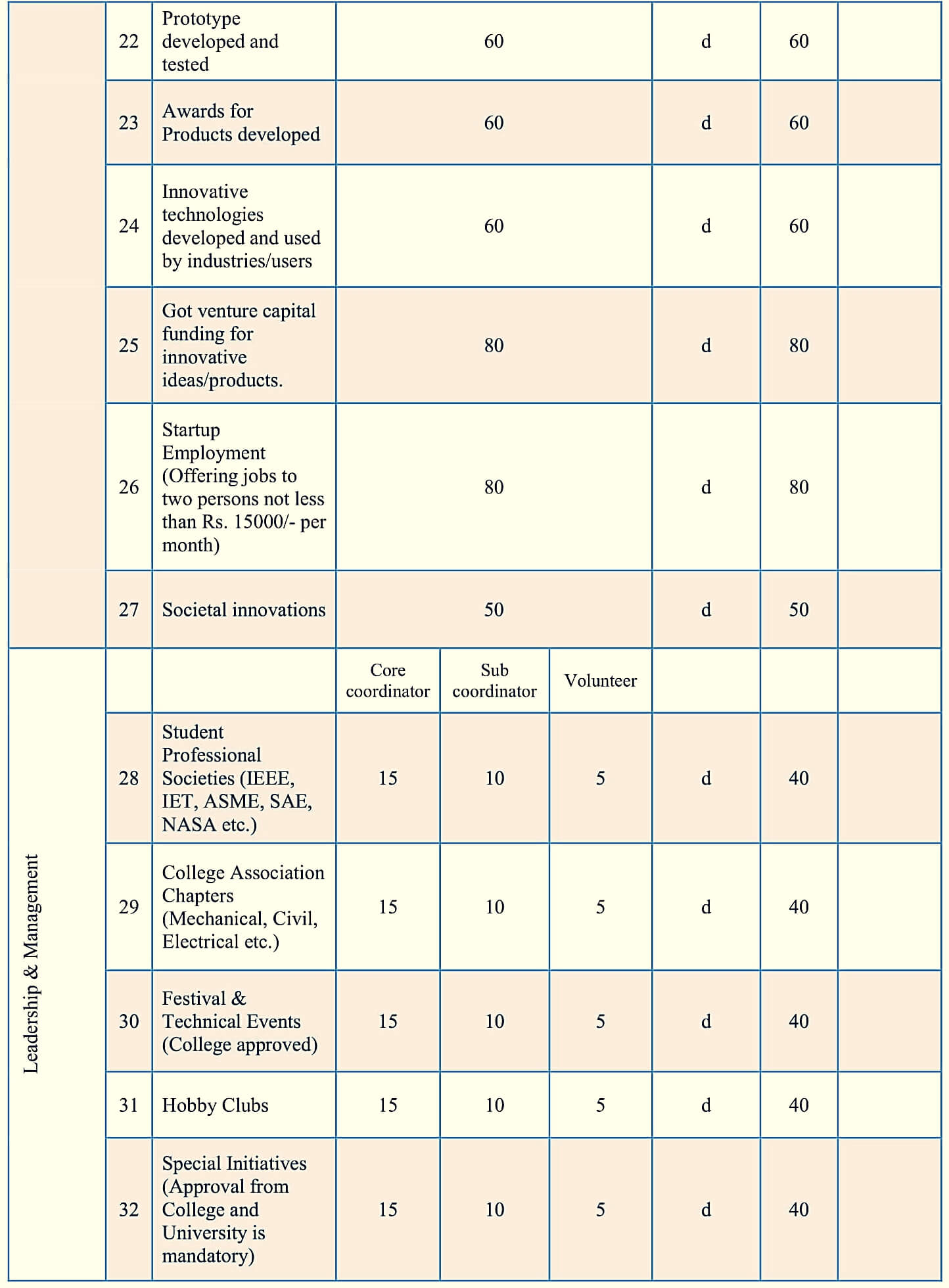 The following table gives the list of activities under each of these segments, the level of achievement expected, activity points, evidence needed to assign the points and the minimum duration needed for certain activities.